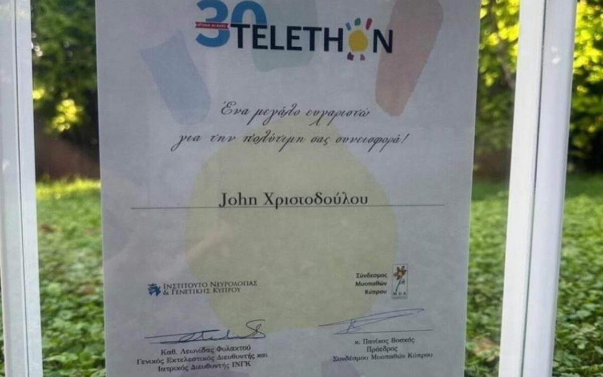 We are pleased to announce that on 14 October, our founder, Mr. John Christodoulou, was honoured in the “Personalities” category, for his significant contribution to Telethon’s 30-year history. Representing the foundation, Mrs. Angela Panayiotou proudly accepted the Honorary Plaque on behalf of the Yianis Christodoulou Foundation. The awards were presented by: Minister of Health, Mr. Michael Damianos, Prof. Michalis Komodromos, Chairman of the Board of the Cyprus Institute of Neurology & Genetics and Panikos Voskos, President of the Cyprus Myopathy Association.